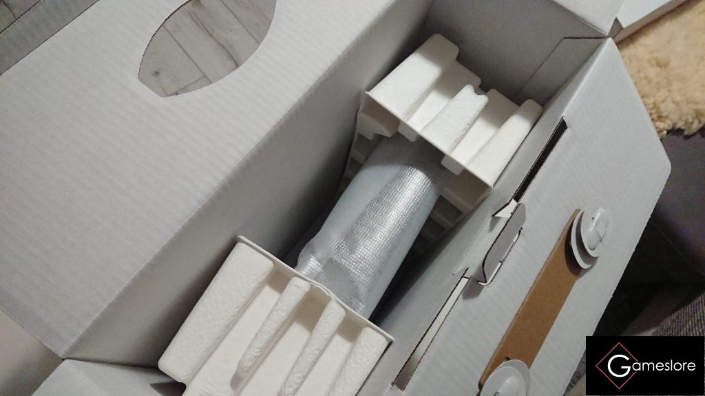 Und das ist jetzt schon etwas ernüchtern. So schön wie bei Marcels Xbox Series X (siehe >>hier seinen Beitrag zur Xbox Series X) ist das Ganze nicht verpackt. Uns erwartet ein länglicher Karton, wo Controller, Standfuß, USB-C sowie Strom- und HDMI-Kabel untergebracht wurde. Nehmen wir Ihn raus, erwarten einen nur zwei Eierkartons, die die Konsole stabil in ihrer Verpackung halten. Also schnell raus aus der Legebatterie.