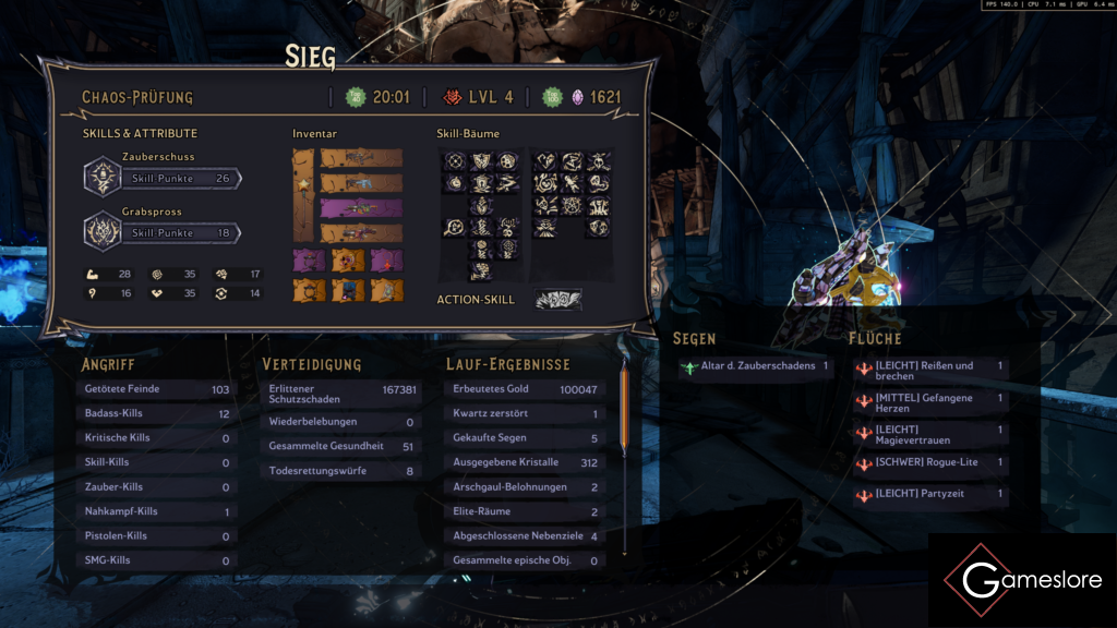 Wenn ihr die Hauptstory durchhabt, kommt auch schon das Endgame und hier gibt es das bis jetzt beste und interessanteste Endgame! Ihr könnt zu einem die Chaoskammern machen, die ähnlich wie die Portale aus Diablo 3 funktionieren, oder aber ihr farmt die Bosse klassisch ab, damit ihr das legendäre Gear bekommt, das nur dieser droppt. Grundsätzlich gilt aber, dass die Chaoskammern weitaus interessanter sind, denn hier müsst ihr Raum für Raum von Gegnern clearen und könnt am Ende eines jeden Raums zwischen Modifiern oder auch mal Buffs wählen. Dabei habt ihr immer ein Nebenziel, wie zum Beispiel eine bestimmte Statue zu zerstören oder aber ihr müsst eine Statue beschützen. Wichtig ist auch, dass man nur eine bestimmte Anzahl an Leben hat und wenn die weg sind, dann ist eure Chaoskammer gescheitert. In den Räumen bekommt ihr neben Gear auch Kristalle. Diese Kristalle könnt ihr am Ende für Gear ausgeben, allerdings könnt ihr euch aussuchen, für welchen Slot ihr was bekommt. So kann man zum Beispiel seine Kristalle für Ringe ausgeben und bekommt dann auch direkt ein paar. So könnt ihr relativ gezielt Sachen farmen.