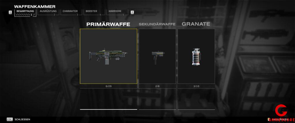Bevor wir uns auf den Weg zum Schlachtfeld machen, müssen wir erst einmal ein paar Vorbereitungen treffen. Zum einen können wir uns erst einmal unser Loadout aussuchen, dazu gehören eine Primärwaffe, eine Sekundärwaffe und die Rüstung. Wichtig ist, dass ihr Waffen, Rüstungen und Booster (dazu komme ich später) über Medaillen freischaltet. Diese verdient ihr euch bei erfolgreichen Einsätzen oder findet sie. Mit diesen könnt ihr in den sogenannten Kriegsanleihen, dann neue Waffen, Rüstungen, Booster und kosmetische Items kaufen. Zusätzlich habt noch die Möglichkeit, Taktikausrüstungen zu kaufen und euer Schiff zu verbessern.