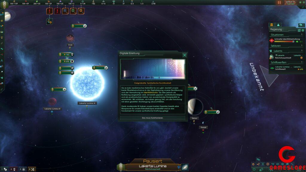 Synthetische Fruchtbarkeit erinnert etwas an die Genophage aus Mass Effect. Die Kroganer konnten sich aufgrund eines Virus nicht mehr fortpflanzen. Zwar spielen in Stellaris nicht die Salarianer die Antagonisten in der Geschichte, dennoch ist es spannend, eine ganze Zivilisation zu digitalisieren und später wieder in Körper zu pflanzen. Das gibt dem Begriff Lebensaufgabe eine ganz neue Bedeutung.