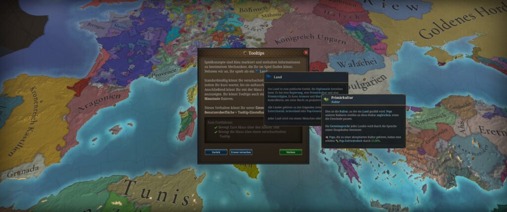 Kurz gesagt: Europa Universalis V macht es Einsteigern leichter als seine Vorgänger – aber leicht ist es deshalb noch lange nicht. Das Spiel weiß sehr genau, wie komplex es ist, und versucht an vielen Stellen, neue Spieler nicht sofort zu überfordern. Tutorials, Hinweise und erklärende Tooltips begleiten einen durch die ersten Spielstunden und helfen dabei, zumindest die grundlegenden Mechaniken zu verstehen.