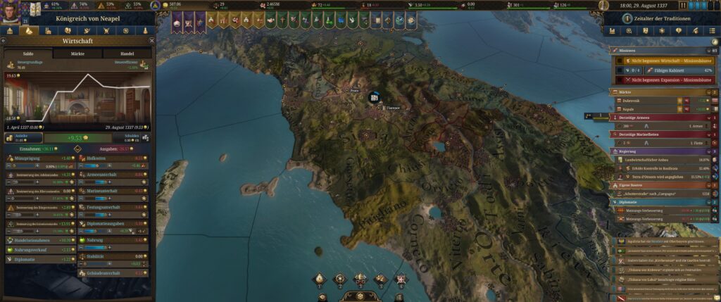 Während der frühen Spielphase läuft das Spiel in der Regel ruhig und übersichtlich. Je weiter die Zeit jedoch voranschreitet und je komplexer die Welt wird – mit mehr Nationen, größeren Reichen, mehr Bevölkerung und mehr aktiven Konflikten –, desto stärker merkt man, dass im Hintergrund extrem viel gerechnet wird. Gerade bei höheren Spielgeschwindigkeiten oder in späteren Spielständen kann es deshalb zu kleineren Pausen oder spürbaren Verlangsamungen kommen.