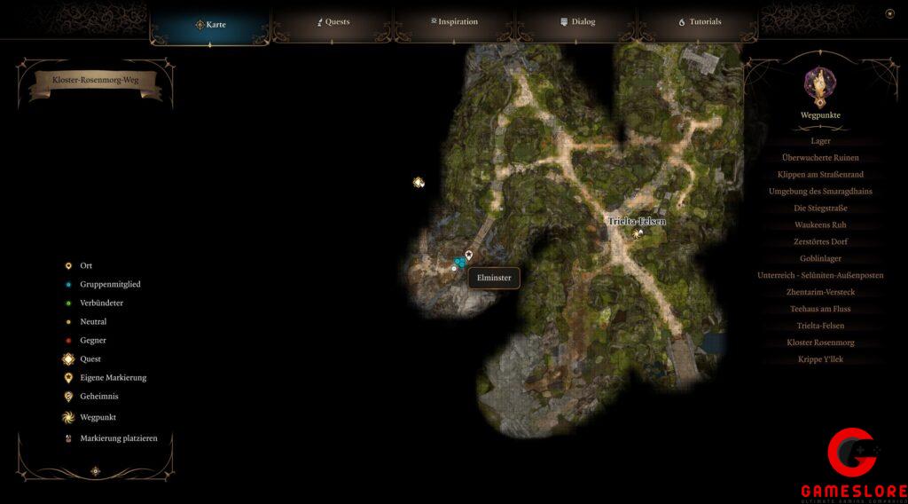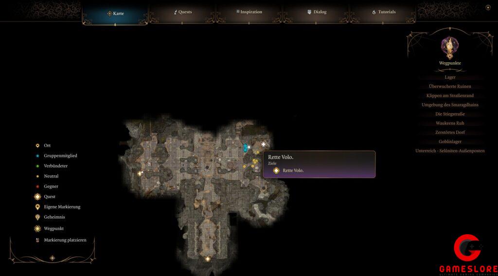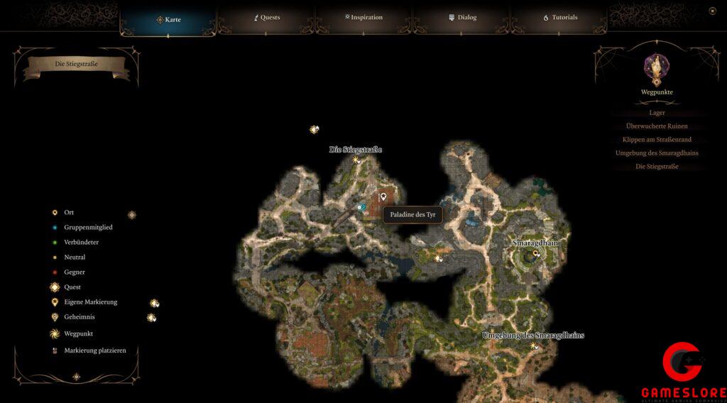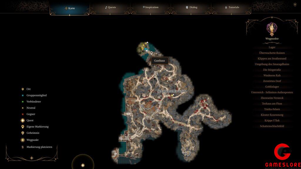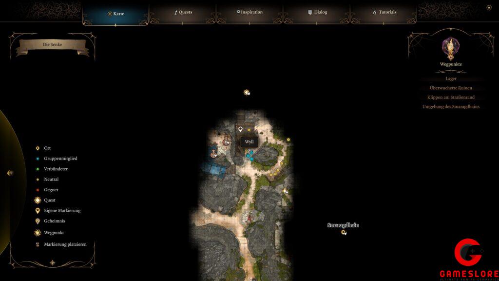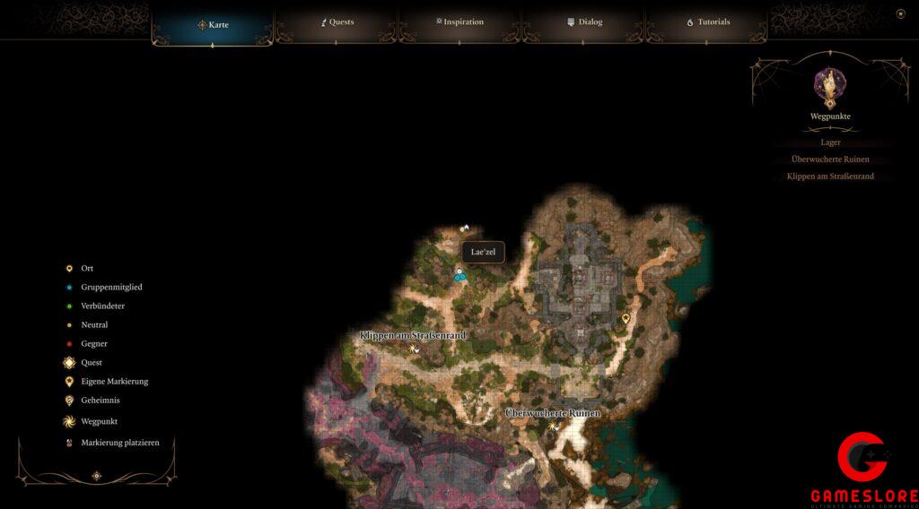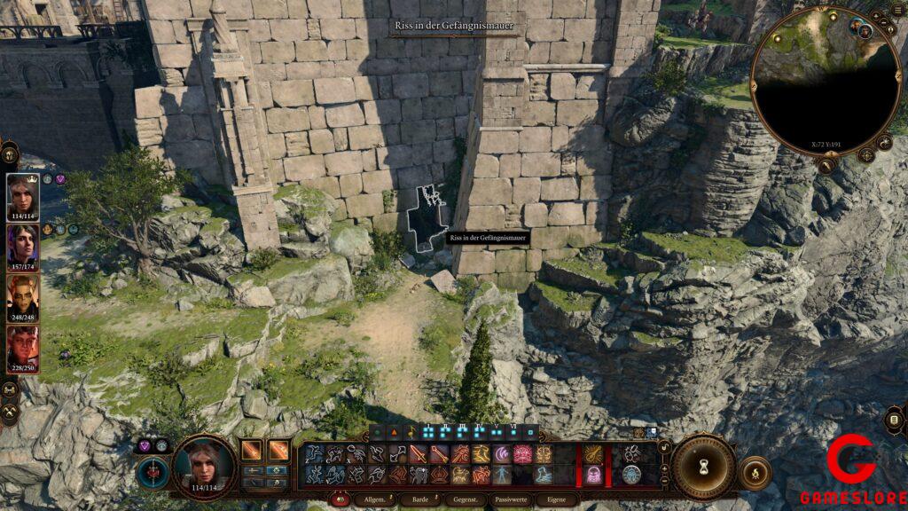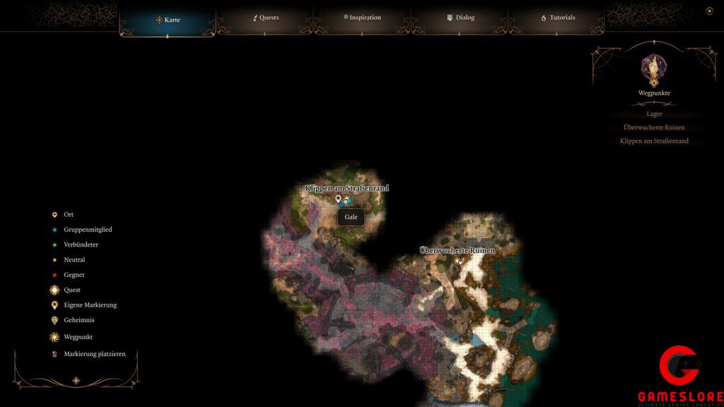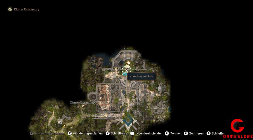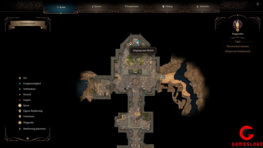 Wenn ihr vom Startpunkt aus direkt nach Norden geht und eine 20 beim Schlossknacken würfelt, könnt ihr direkt in die Gruft. Sonst müsst ihr außen herum gehen. Auch hier gibt es mehrere Wege. Ihr könnt beispielsweise erst einmal Gale abholen, dann zur im Bild unten gezeigten Markierung.