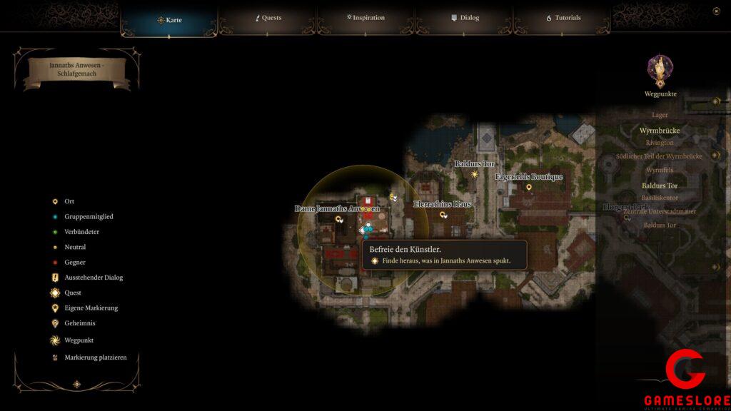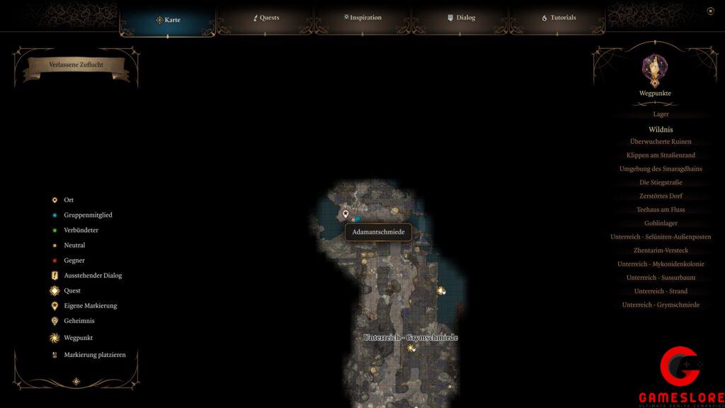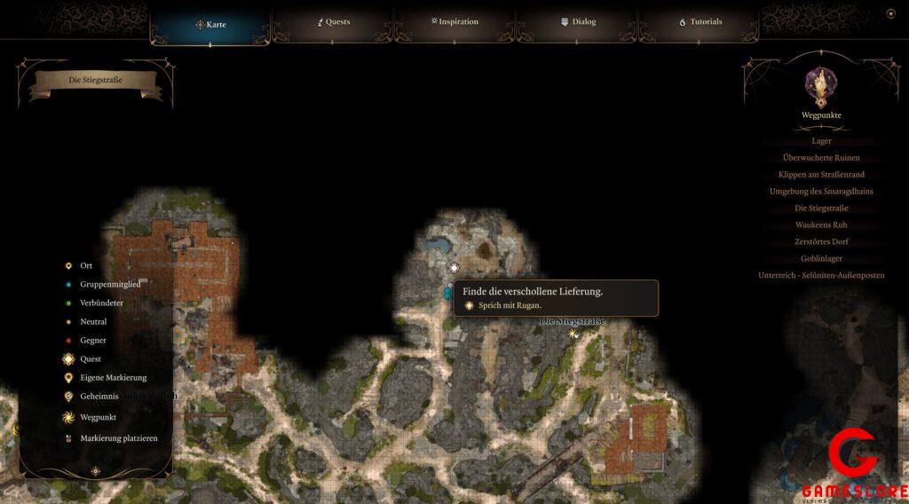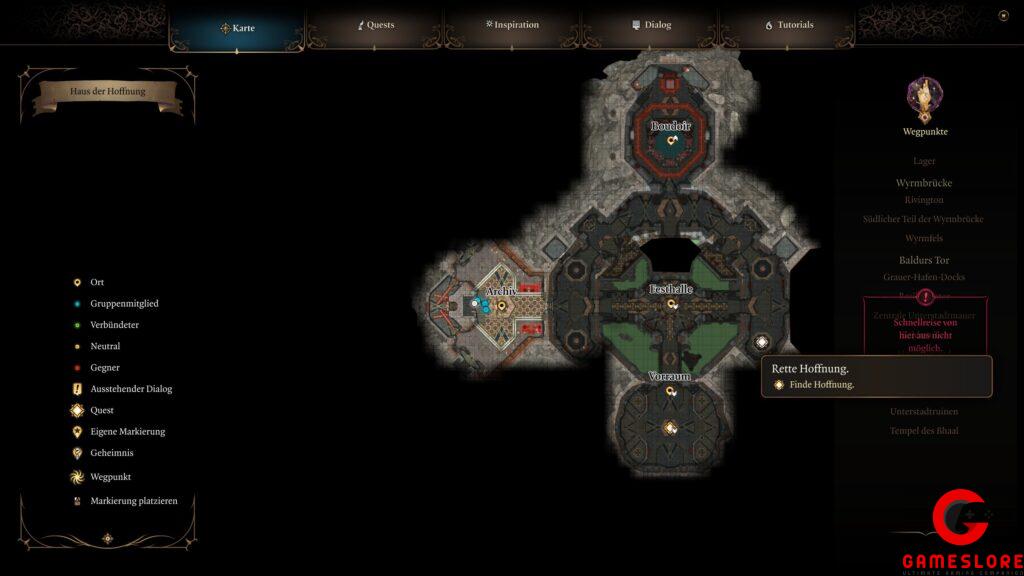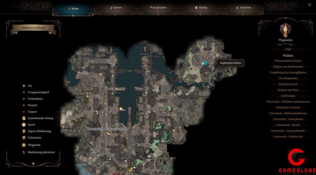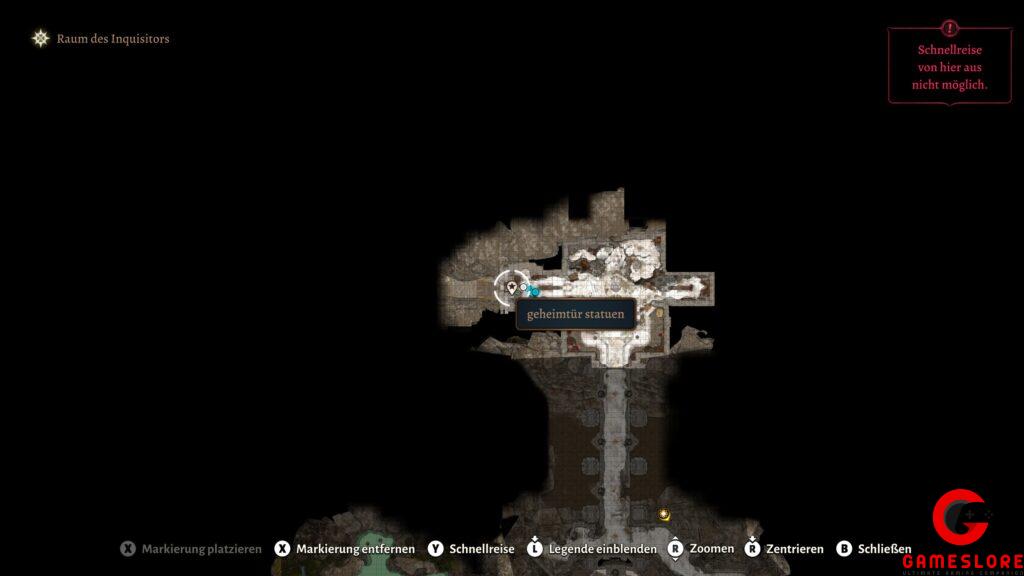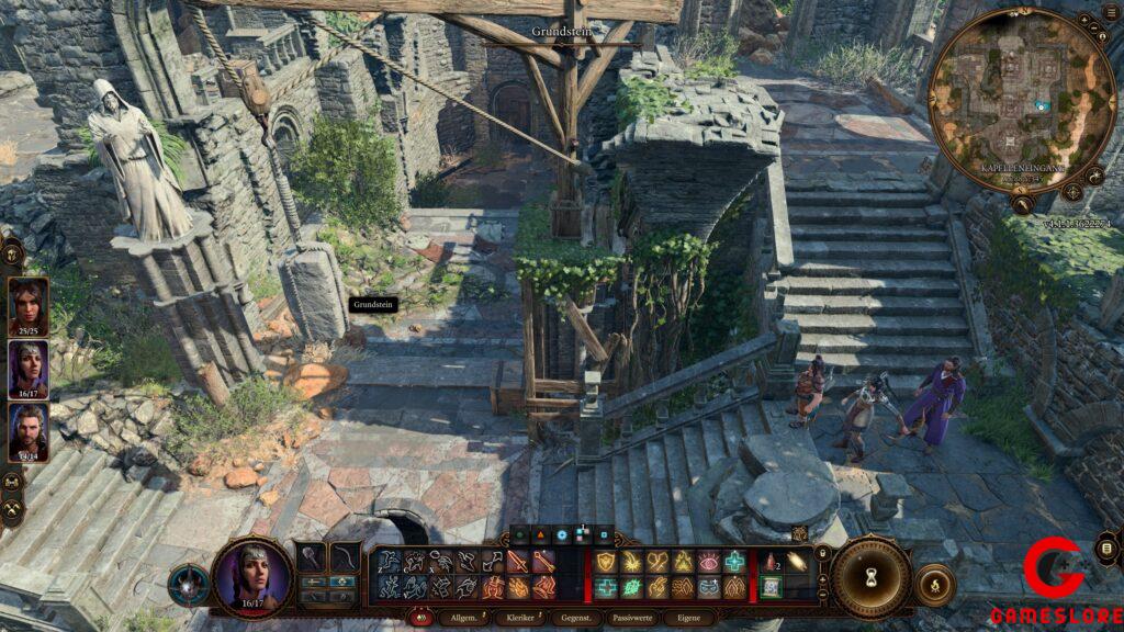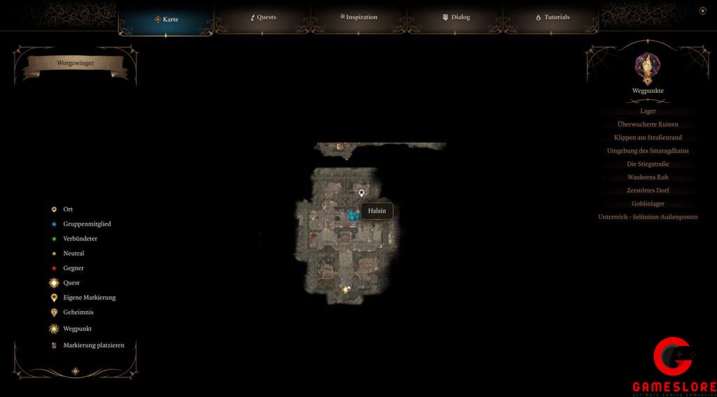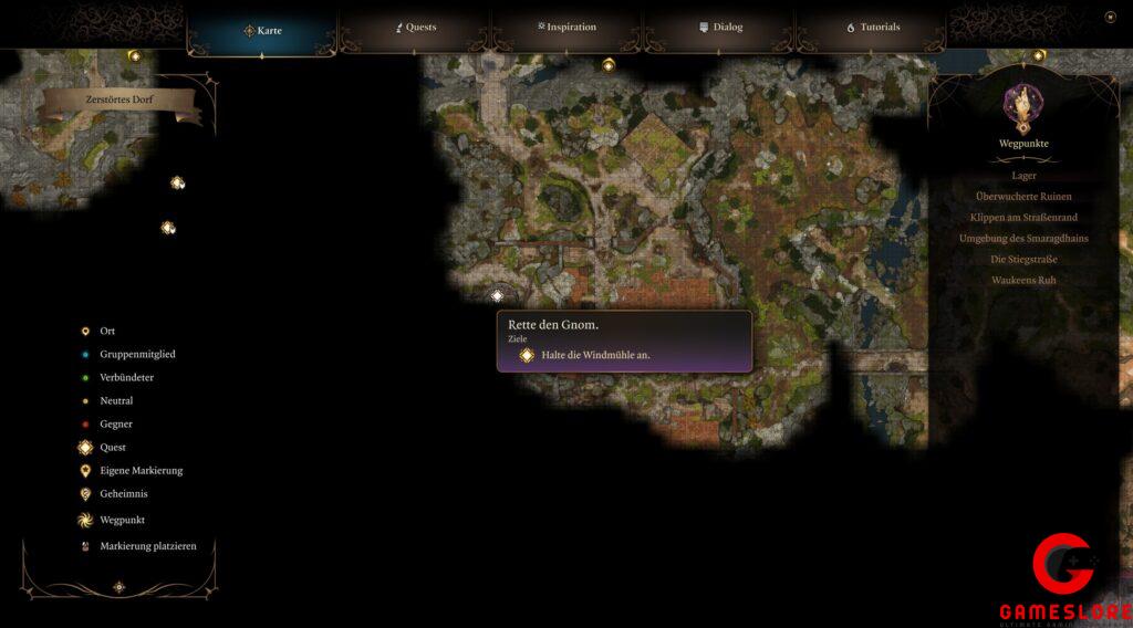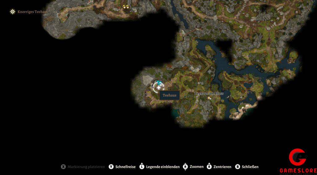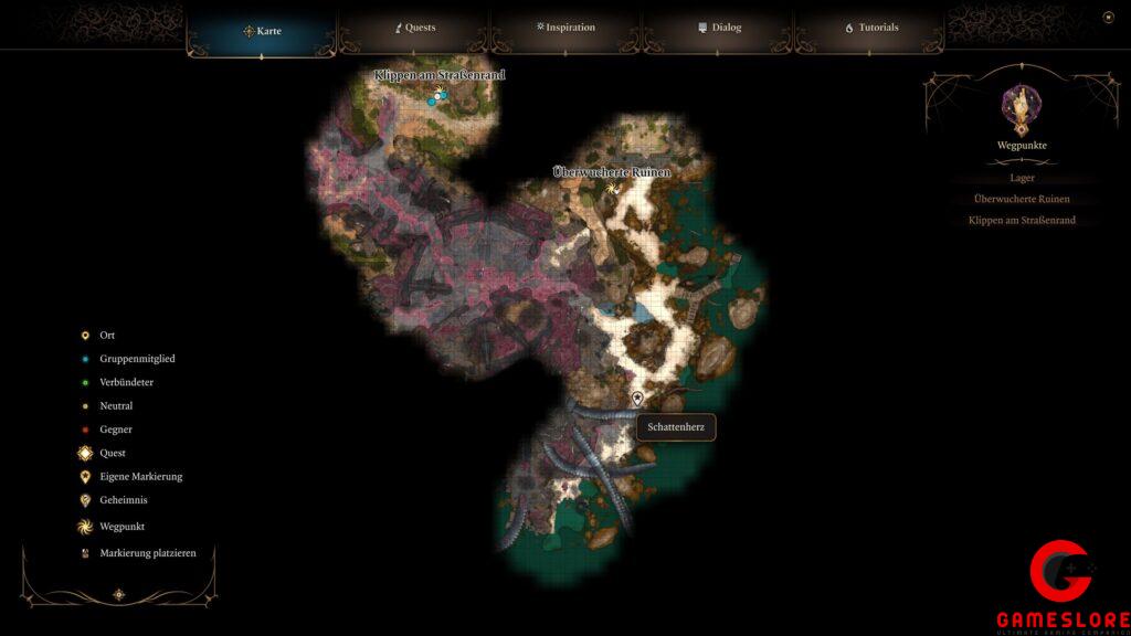 Wenn ihr vom Startpunkt aus direkt nach Norden geht und eine 20 beim Schlossknacken würfelt, könnt ihr direkt in die Gruft. Sonst müsst ihr außen herum gehen. Auch hier gibt es mehrere Wege. Ihr könnt beispielsweise erst einmal Gale abholen, dann zur im Bild unten gezeigten Markierung.