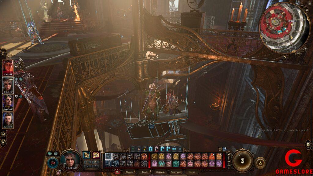 Im Eisernen Thron angekommen, möchte dieser nicht nur euch, sondern auch gleich alle Gefangenen in die Luft jagen. Ihr habt nur wenige Züge Zeit, um sowohl Omeluum zu befreien, als auch Ravengard, wenn ihr euch dafür entschieden habt, ihn für Wyll sterben zu lassen. Wenn ihr Ravengard versucht zu retten, wird sich dementsprechend Mizora einmischen. Rettet ihn und alle Gefangenen („Rette die Gondier“) zuerst und lasst nur eine Person zu Omeluum eilen, denn dieser kann sich selbst und einen Gefährten direkt zurück teleportieren, bevor alles in die Luft gesprengt wird. Die Zeit ist recht knapp bemessen und ihr müsst den Rückweg mit einkalkulieren. Teilt eure Gruppe also gut auf die drei Himmelsrichtungen, in denen Gefangene liegen, auf.