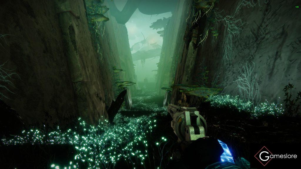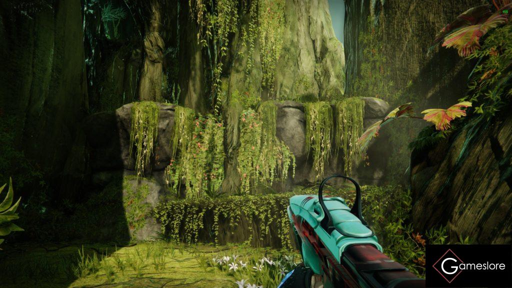 Über diese großen Blätter geht es nun weiter. Passt auf nicht in die Radiolariaflüssigkeit zu fallen, sonst sterbt ihr. Schießt auf die Blumen, dann gehen sie für eine gewisse Zeit auf. Das ermöglicht, auf sie zu springen.