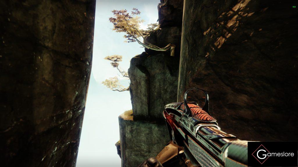 An einem Felsenvorsprung schaut ihr nun ganz gerade nach unten. Lasst euch fallen und links von euch in einer Felsspalte habt ihr eine geheime Truhe.