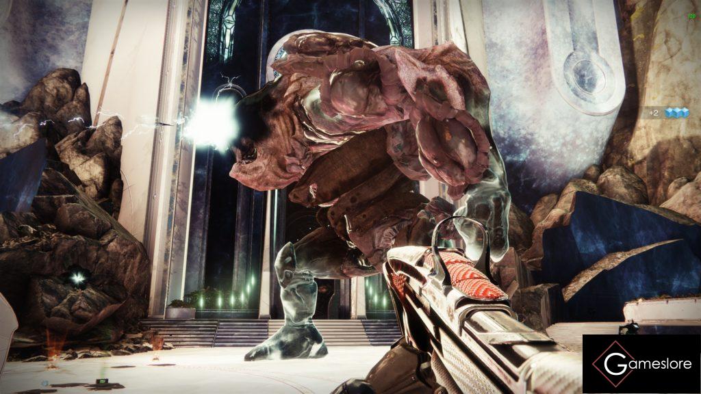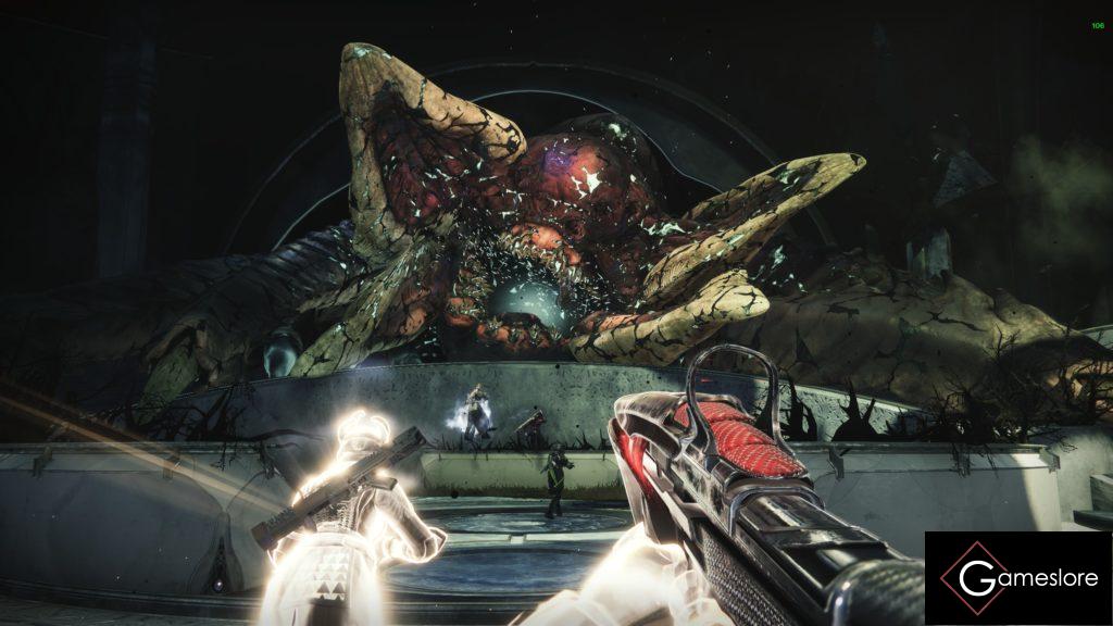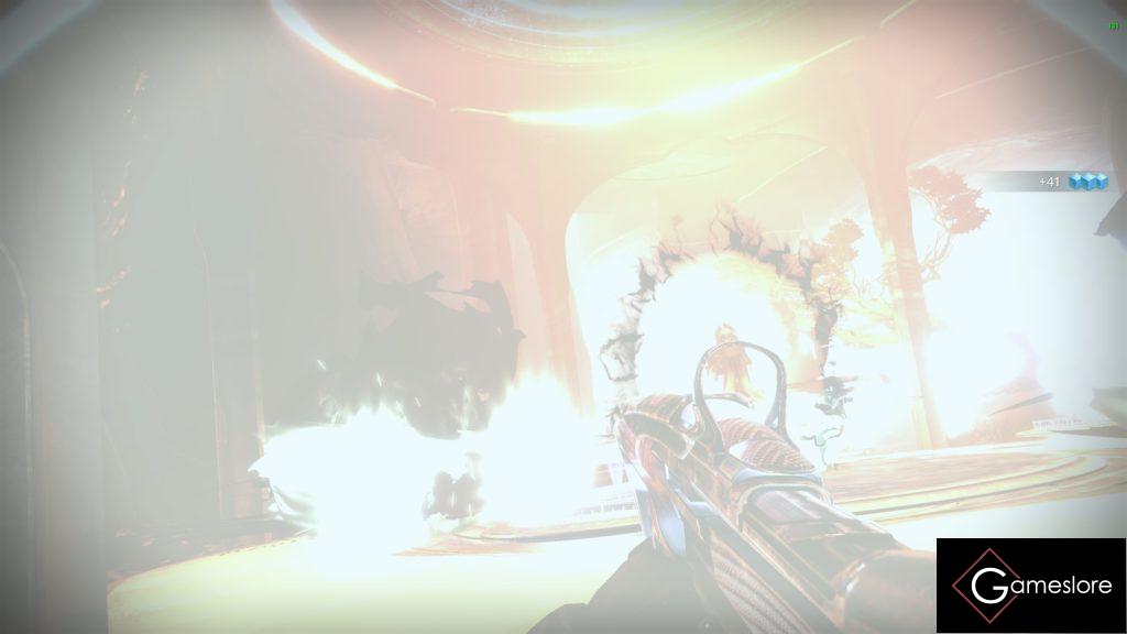 Variante 2: Ihr rennt links oben neben sie und haut alles auf ihre Hand. Debuffs, Super, alles drauf. Das ginge zum Beispiel mit dem Exoschwert “ Klage“ sehr gut.