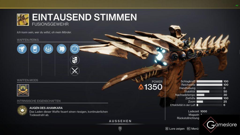 Die “ Eintausend Stimmen“ ist eine total brutale Waffe. Sie feuert einen Fusionslaser, der dann in Form einer Linie explodiert und alles auf dem Weg mit sich reißt.