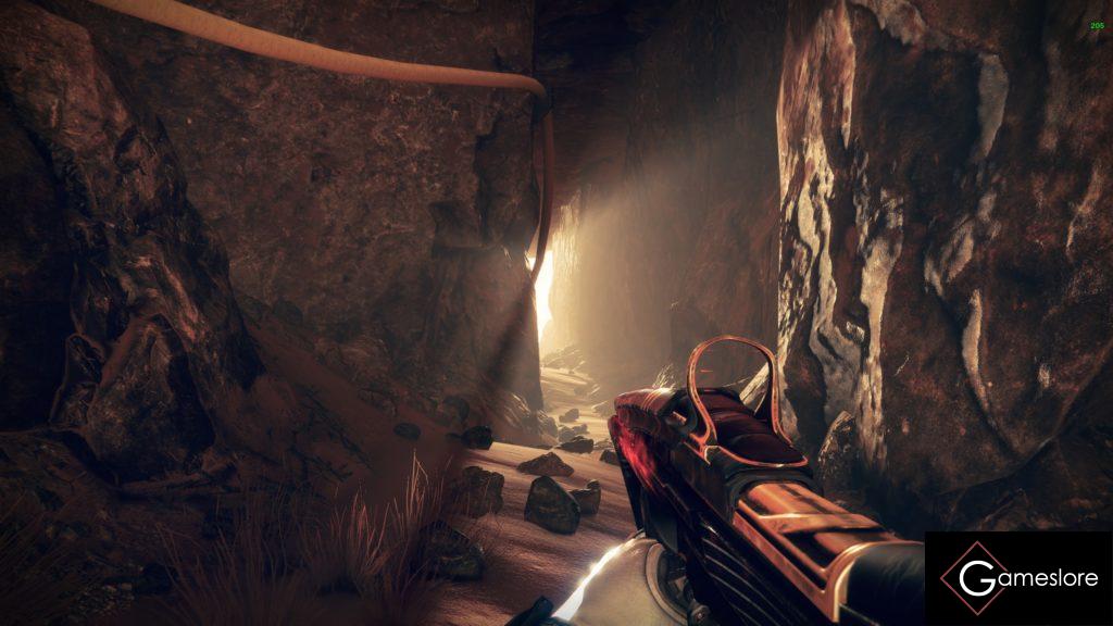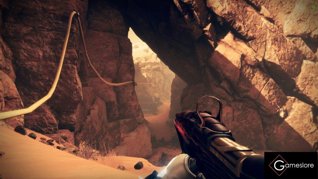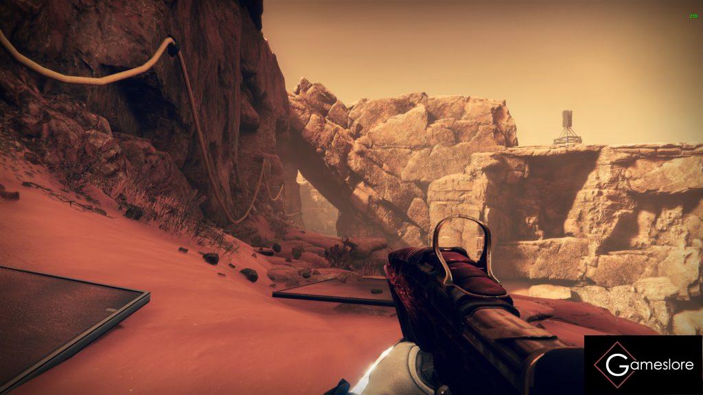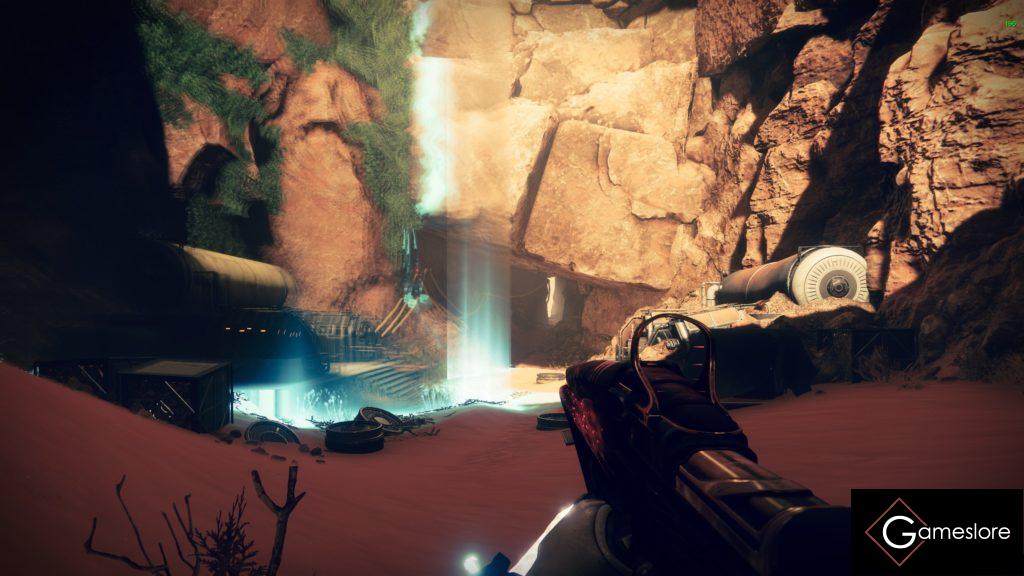 Ihr startet direkt auf dem Mars in einer Sackgasse und müsst nun an dem blau schimmernden Vorhang, geradeaus vorbeigehen.