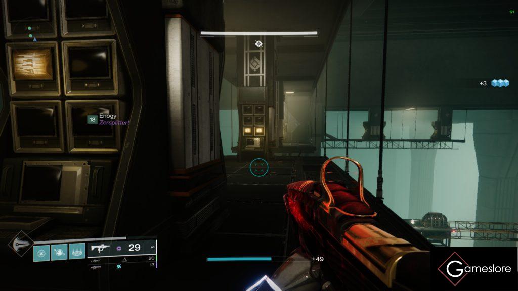Im Bossraum geht es darum, den Schild vom Boss aufzulösen und ihm dann Schaden zu machen. Der Raum teilt sich in zwei Teile auf. Es gibt den vorderen Raum, dort wo ihr steht und den Reaktorraum dahinter. Aus der Richtung kommt der Boss auf euch zu. Passt ein bisschen auf, er macht enorm viel DMG.