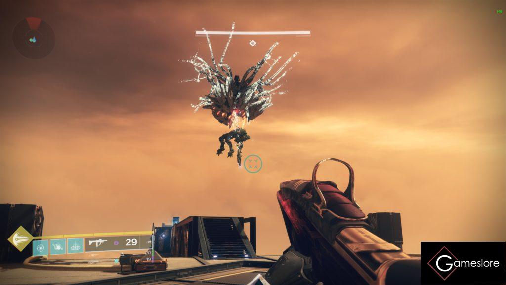 Der Boss kommt zu euch geflogen und streckt die Flügel aus und zeigt euch seine roten Augen. Schießt alle ab. Habt ihr das getan, strauchelt er und sein Auge in der Mitte leuchtet weiß. Er fliegt nun vor euch weg nach hinten. Gebt alles und schießt, was ihr könnt auf seine Mitte. Ist die Phase vorbei, aktiviert er eine Druckwelle, die euch zurückstößt.