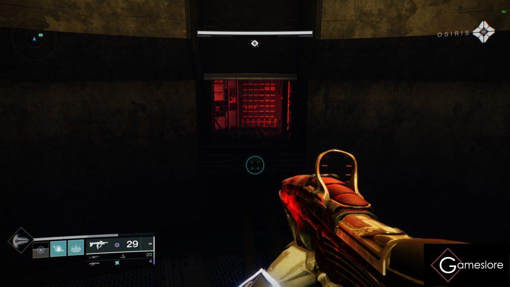 Den Schild fahrt ihr herunter, indem ihr am Anfang einen Leitungsminotaurus links oder rechts tötet und zuerst die roten Kabel verbindet. Schießt auf die fünf Knoten – je an der Säule und über der Tür gerade zu.