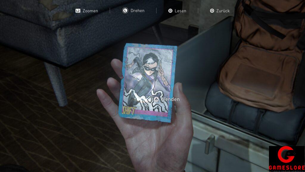Gehe nun etwas herum und du siehst in einer Ecke unter einem Tisch die Sammelkarte.