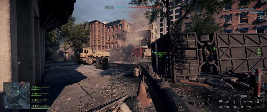 Kommen wir zum Abschluss noch einmal zur Zerstörung – denn die ist endlich wieder zurück! Fassaden stürzen ein, Häuser brechen teilweise zusammen. Natürlich könnt ihr keine ganze Stadt dem Erdboden gleichmachen, aber es geht ziemlich viel kaputt – und das fühlt sich einfach genial an. Gerade, wenn ihr durch eine Straße lauft, über euch die Fassade einstürzt und ihr es gerade noch so herausschafft, während hinter euch eure Kameraden fallen.