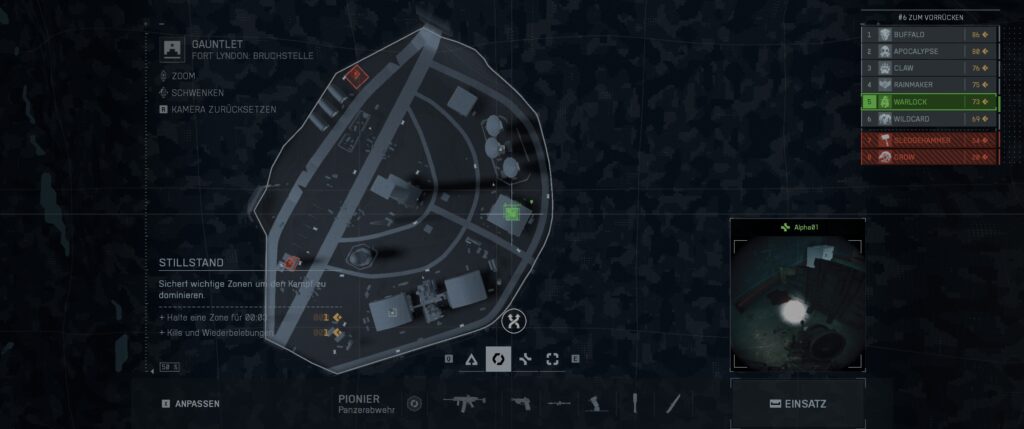 Zusätzlich gibt es noch Waffendrops, bei denen ihr euch eine eigene, zuvor ausgerüstete Waffe holen könnt. Diese Drops erscheinen nach einer gewissen Zeit im Match und sind für jedes Squad zugänglich. Außerdem gibt es Missionen, die ihr auf der Karte auswählen könnt. Sie belohnen euch mit Ausrüstung und manchmal auch mit einer Schlüsselkarte. Mit dieser lassen sich an bestimmten Punkten Panzer anfordern, die ihr das gesamte Match über nutzen könnt – solange sie nicht zerstört werden. Daher sollte man idealerweise immer einen Pionier im Team haben. Auch eure Klassenkomposition spielt also eine wichtige Rolle.