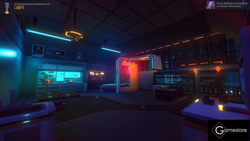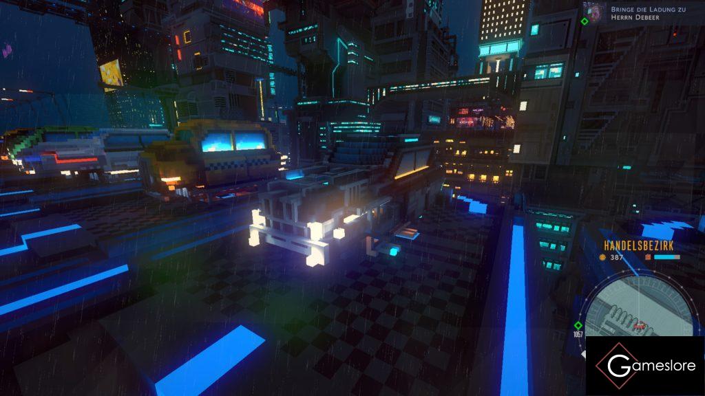 Von hinten bis vorne wurde die komplette Welt und deren Bewohner im Pixel-Look entwickelt. Jedoch nicht im Style wie »Minecraft«. Die Würfel gibt es hier schon in verschiedenen Größen. Somit wirkt das Bild von Weitem wirklich super und man verliert sich in den trostlosen, aber schon sehr schönen Neonlichtern und den Hochhaus-Canyons der fliegenden Stadt. Aber sobald man nah an Objekte ranfliegt verliert das Gesamtbild an Kraft. Generell muss man bei einigen Objekten viel rein interpretieren oder mehrfach aus verschiedenen Blickwinkeln gucken, um zu erahnen, was die Künstler uns damit sagen bzw. zeigen wollten. Wie bei einem Bild, an das man zu nah ranzoomt. Insgesamt hält sich somit »Cloudpunk« grafisch also recht minimalistisch, weiß aber mit Licht und Schatten sehr gut umzugehen und setzt somit schöne Akzente. Jedoch wird man das Gefühl nicht los, dass sich viele Elemente ständig wiederholen. Die Welt von »Cloudpunk« ist in verschiedene Gebiete unterteilt, die auch mit einer Ladezone voneinander getrennt sind. Jedoch unterscheiden sich diese nur in sehr, sehr kleinen Details und haben kein großes Alleinstellungsmerkmal. Etwas mehr Vielfalt hätte hier und da nicht geschadet.