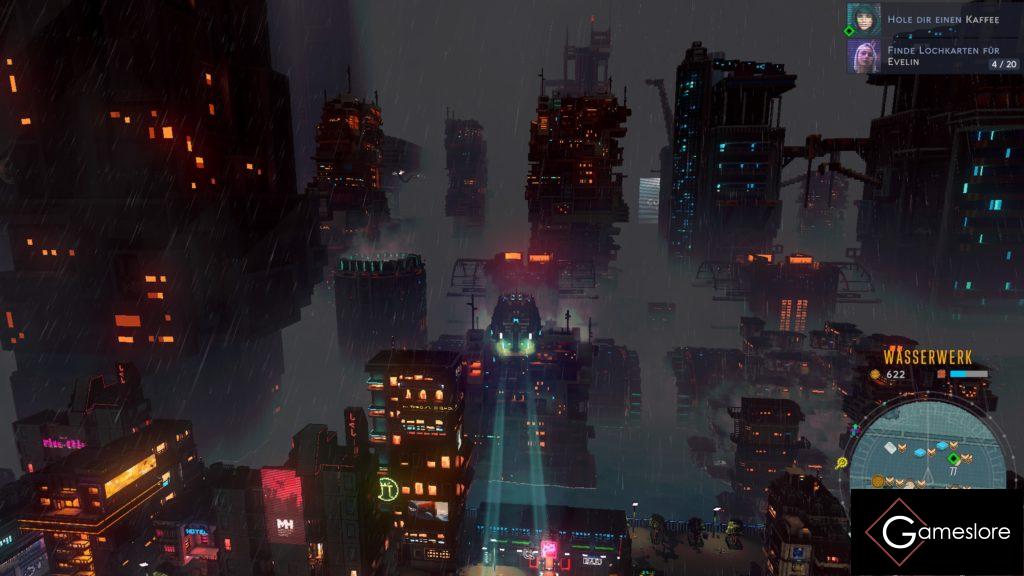 »Cloudpunk« sieht zwar nach 16bit aus, klingt aber nicht so. Neben epischen Synthesizer Sounds kracht ein nie enden wollender Regen als Nebengeräuschen pausenlos um die Ohren. Dazu kommen die typischen Stadtgeräusche, wie Polizeisirenen, Werbesprecher oder Ansagen zum aktuellen Zeitgeschehen in der Welt. Wirklich ruhige Momente werdet ihr nie erleben.