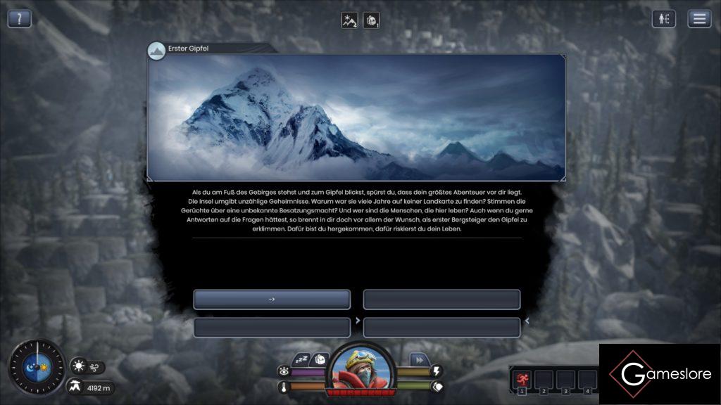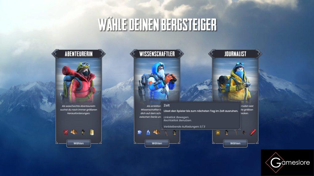 Bevor es aber auf den Berg geht, muss man sich für einen von drei Bergsteigern entscheiden. Da wäre einmal der Abenteurer, dann der Forscher und zu guter Letzt der Journalist. Jede dieser „Klassen“ hat bestimmte Eigenschaften. So kann der Forscher etwas forschen und kriegt Erfahrungspunkte, dafür muss man aber Zeit investieren. Genauso unterscheiden sich die Starteigenschaften. Dann kann man sich einen von drei Gipfeln aussuchen und eine von drei Routen. Diese unterscheiden sich in Schwierigkeit und in Events, die auftreten können. So können einem zum Beispiel Erscheinungen begegnen.