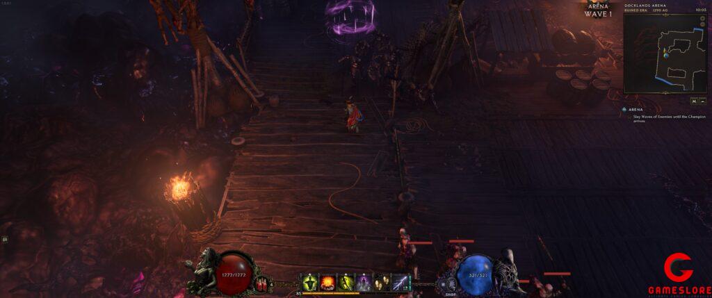 Fangen wir erst einmal mit der Arena an. Die ist einfach erklärt. Ihr reist zur Arena, setzt den Schlüssel ein und besiegt eine Anzahl X an Wellen, bis ihr einen Boss trefft. Es gibt zusätzlich noch eine Level 100 Arena, die endlos ist. Interessanter wird es bei den Dungeons, denn diese bedienen immer ein anderes Thema. Zum Beispiel gibt es einen Dungeon, in dem ihr immer wieder zwischen zwei Zeitebenen wechseln müsst, um weiterzukommen. Das ist an sich erst mal cool. Allerdings gilt auch hier erst Schlüssel einwefen, dann Schwierigkeit wählen und weiter geht es. Ansonsten folgen die Dungeons der klassischen Formel. Es gibt ein paar Ebenen, dann kommt der Boss und ihr seid fertig. Ich muss halt sagen, dass ich die Monolithen da spannender und auch belohnender finde. Natürlich gibt es Uniques, die nur in einem bestimmten Dungeon droppen, aber es ist halt einfach nicht so belohnend und spannend wie die Monolithen.