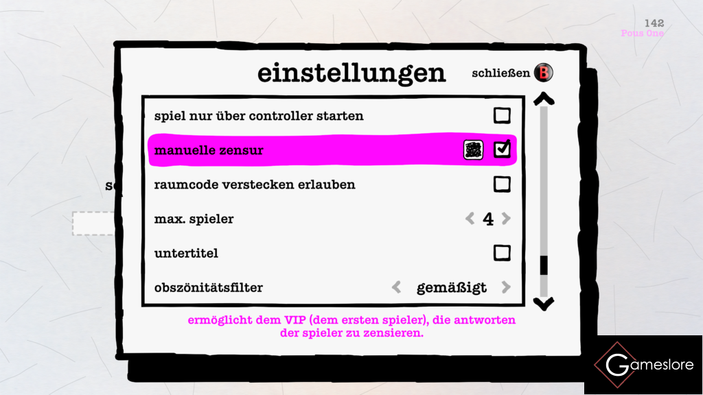 Was vielleicht noch noch interessant zu wissen ist: Drawful 2 lässt einem sehr viele Einstellungsmöglichkeiten. So könnt ihr entscheiden, ob ihr das Spiel auf Deutsch oder Englisch spielen wollt. Und da ist noch nicht Halt. Neben der Anzahl der Spieler*innen, sowie Zeitmanagement der Runden und wie lange gezeichnet oder geraten werden darf, kann man noch den Grad der Zensur wählen, somit kann man auch mal die kleinen Gamer unter uns gefahrenlos mitspielen lassen, ohne dass die Gefahr besteht, dass diese einen geflügelten Dildo zeichnen.