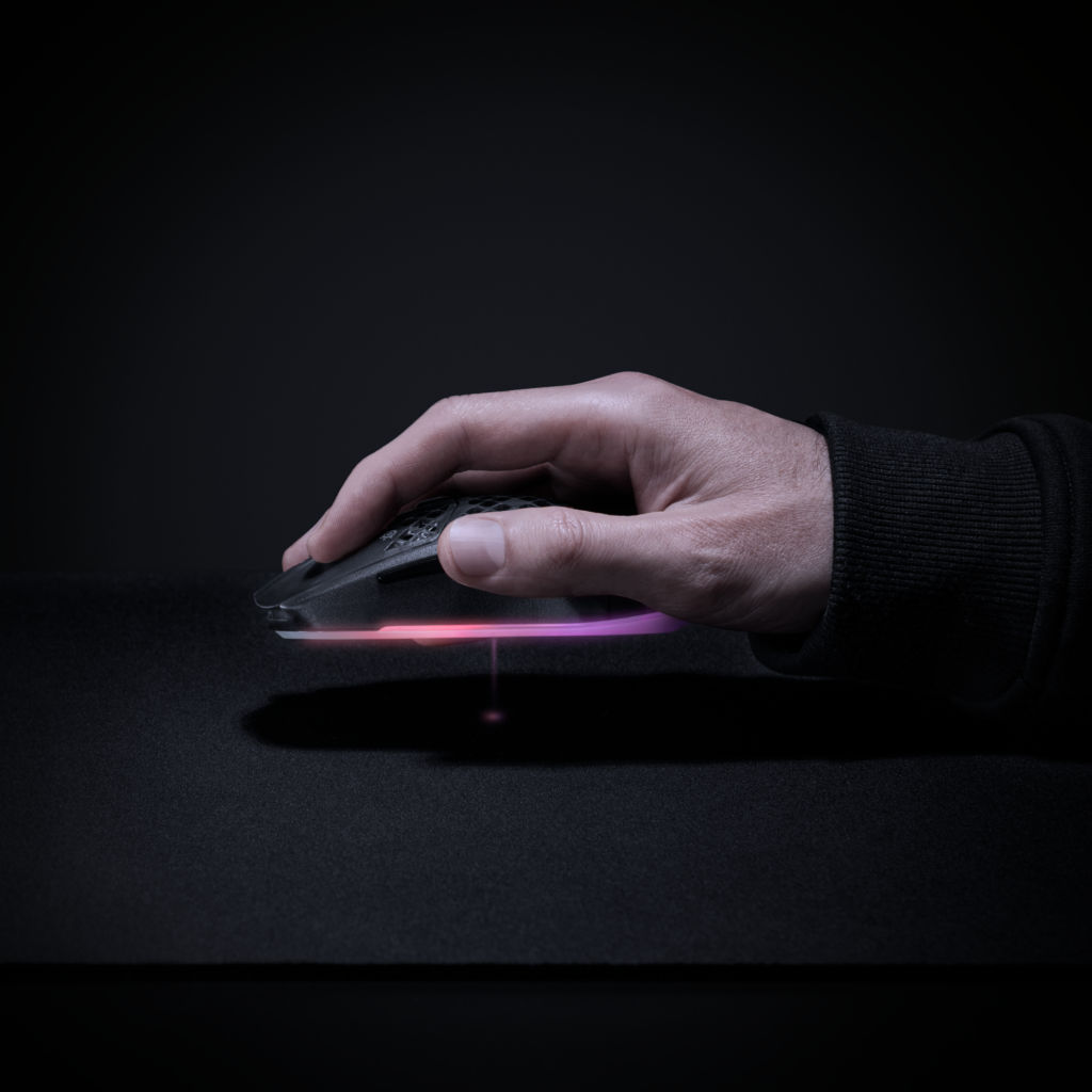 Auf der Maus finden wir das übliche Setup: fünf Maustasten, das Mausrad und eine dedizierte DPI-Taste, um die Abtastrate im laufenden Betrieb anzupassen. Optisch setzt SteelSeries auf das mittlerweile etablierte, moderne Waben- beziehungsweise Loch-Design, das den Nager auf federleichte 68 Gramm drückt.